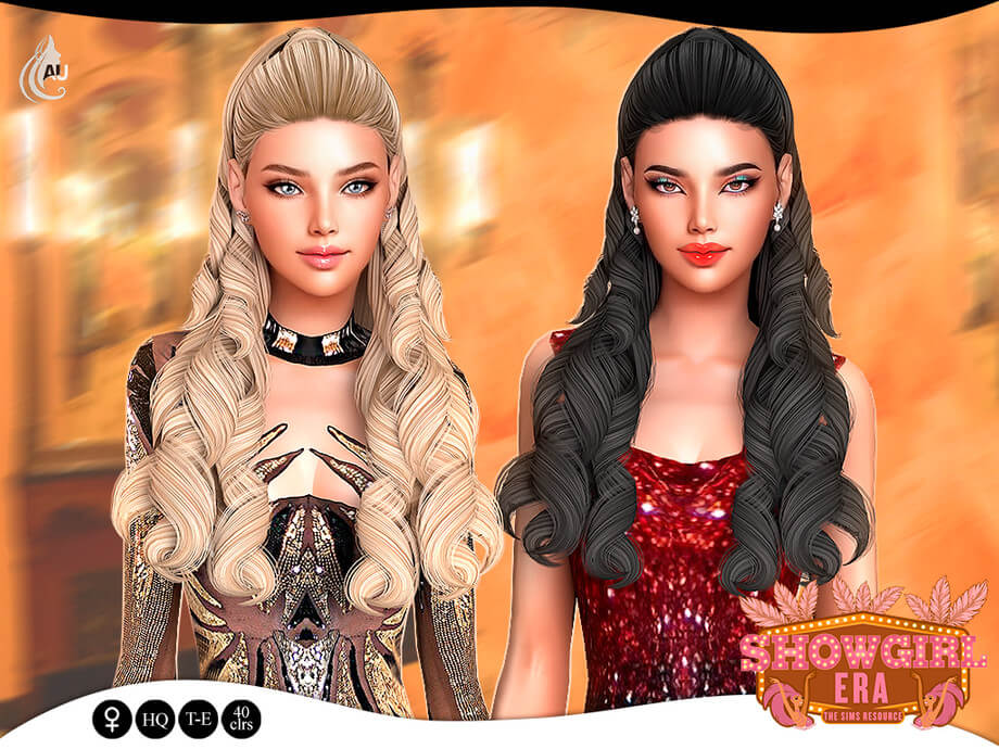 Showgirl Era – Showgirl hairstyle v3 High ponytail with curly strands for your showgirl sim Base game compatible Female frame only 40 swatches (naturals, unnaturals, color strands) All LODs Hat compatible HQ compatible Smooth weights Custom thumbnail Minor transparent issues