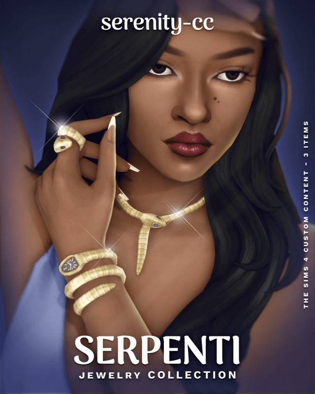 The Serpenti Jewelry Collection (3 items) by Serenity-cc oday I’m bringing another jewelry classsssic 🐍 . The Serpenti Collection is perfect for adding a touch of elegance and sensuality to any look. 💋 The collection features 5 new items in total. The watch and rings are available for both the left and right sides and are also compatible with male frames. More details: Teen-Elder. Custom thumbnails Base game compatible.