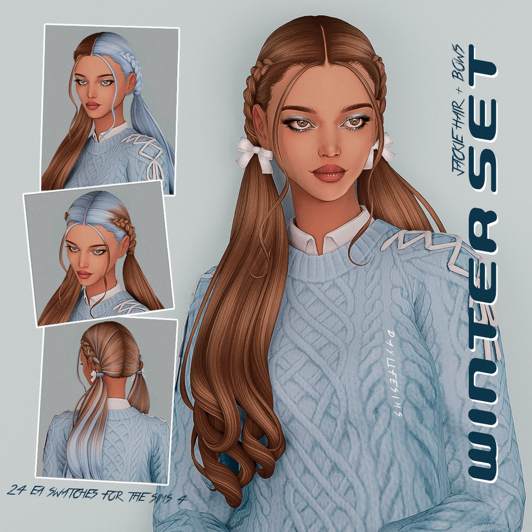 WINTER SET – Jackie Hair and Bows accNew mesh Base game compatible 24 EA colours Hat compatible Bows accessory found in hats All LODs Custom Thumbnail Download colour accessories here